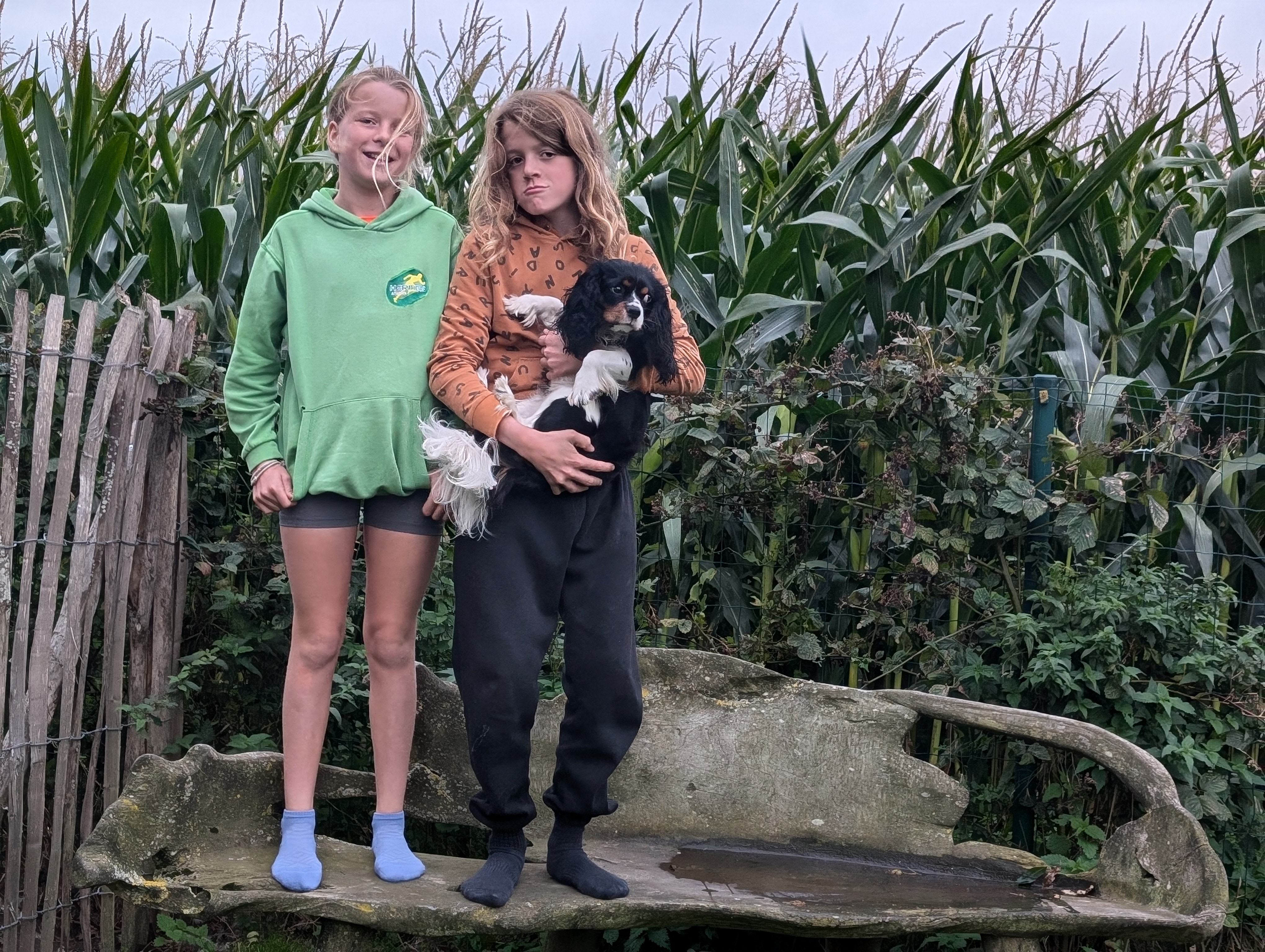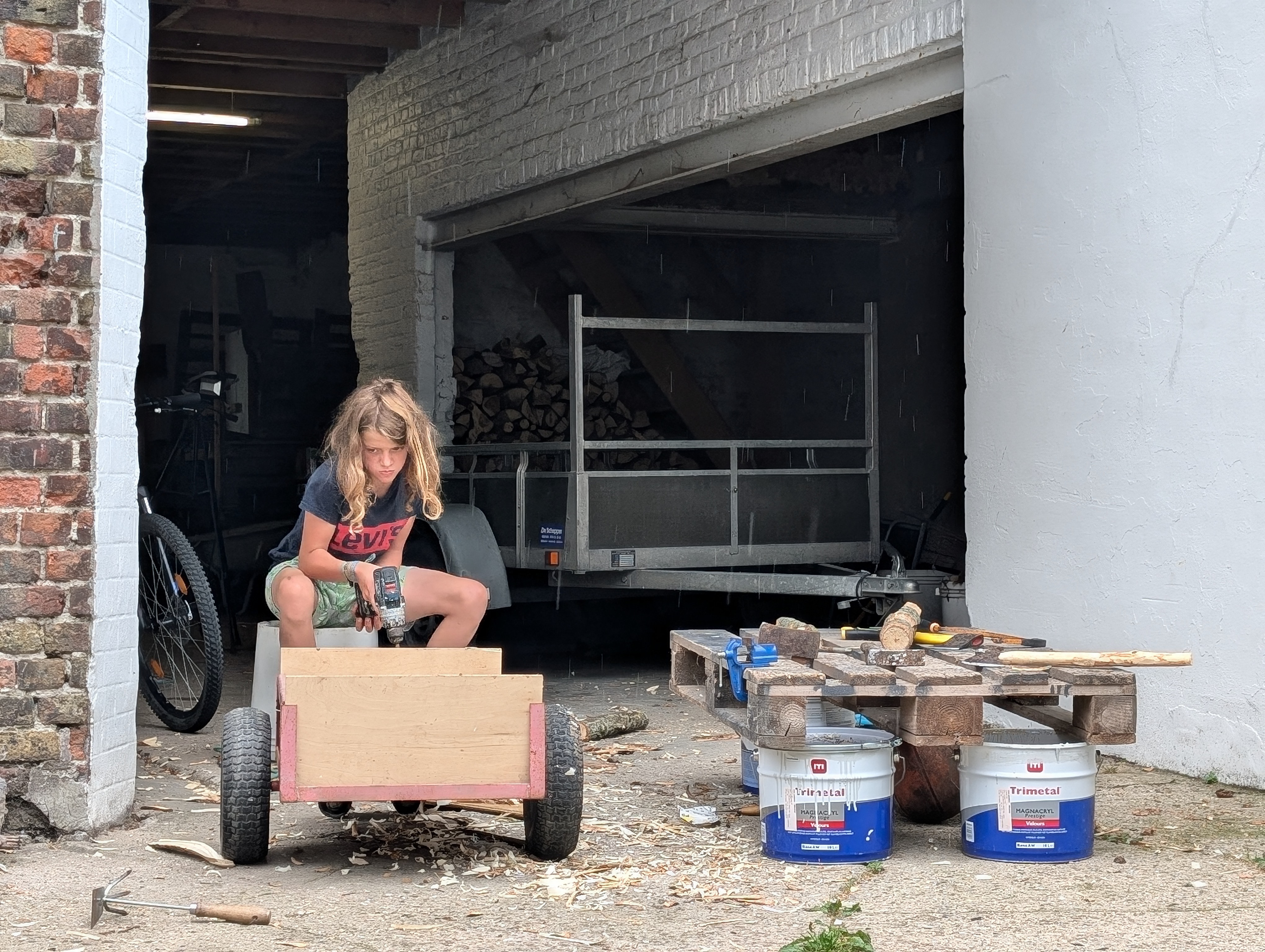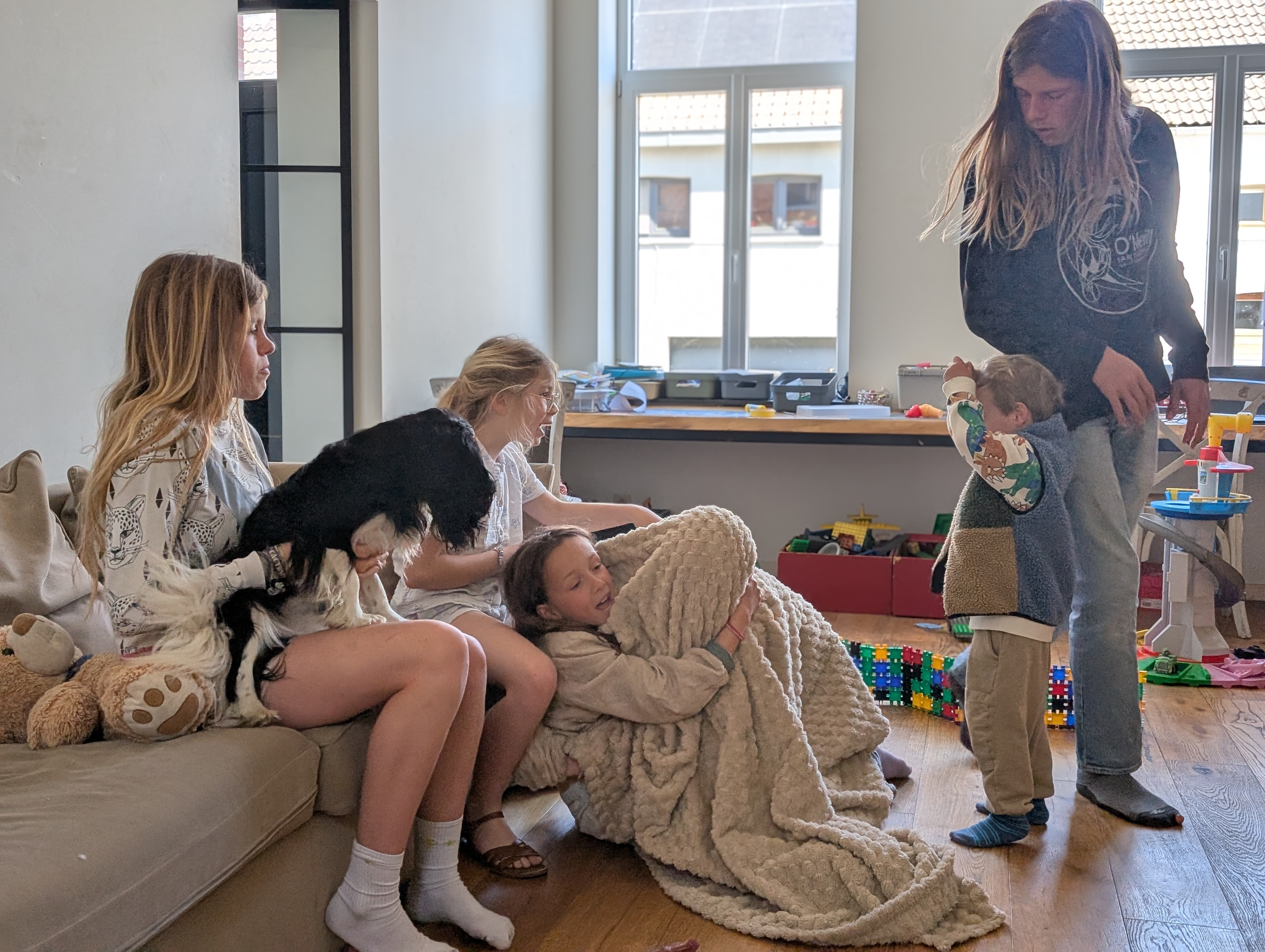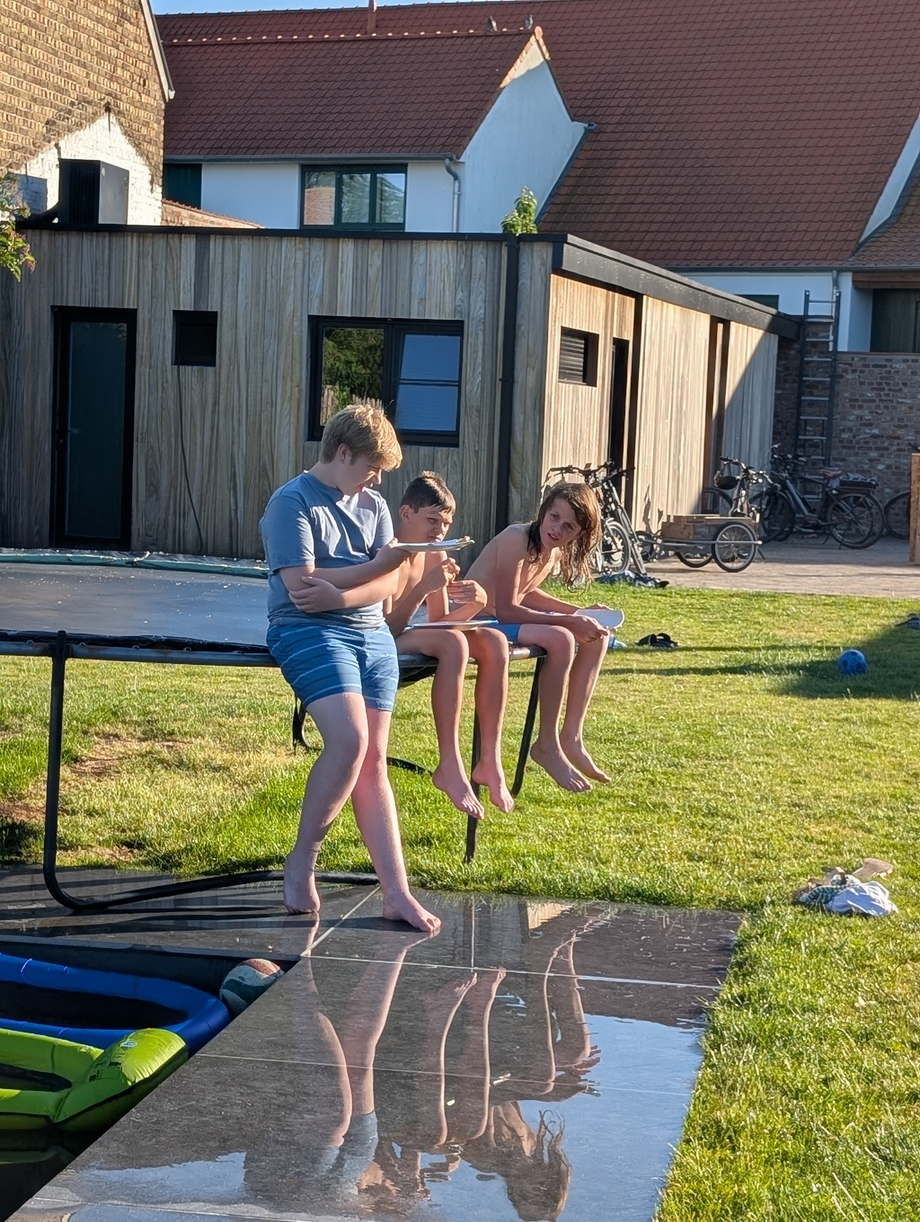 De kroost doet het goed en scharrelt goddank nog steeds heel erg graag dichtbij rond. Kampen van scouts en Kazou worden ten volle beleefd – op dit eigenste moment is er nog een vanuit Zweden onderweg naar huis – maar dagen thuis, daar houden ze eigenlijk ook wel van. Het is een va-et-vient van nichtjes en buurkinderen. Heerlijk om te zien hoe een 13- of een 15- jarige de 3-jarige buurjongen op sleeptouw neemt, hoe de kleine nichtjes met gemak over de schouders van de oudste neven worden gegooid en hoe ook heel wat andere kinderen zich bij ons helemaal thuis voelen.