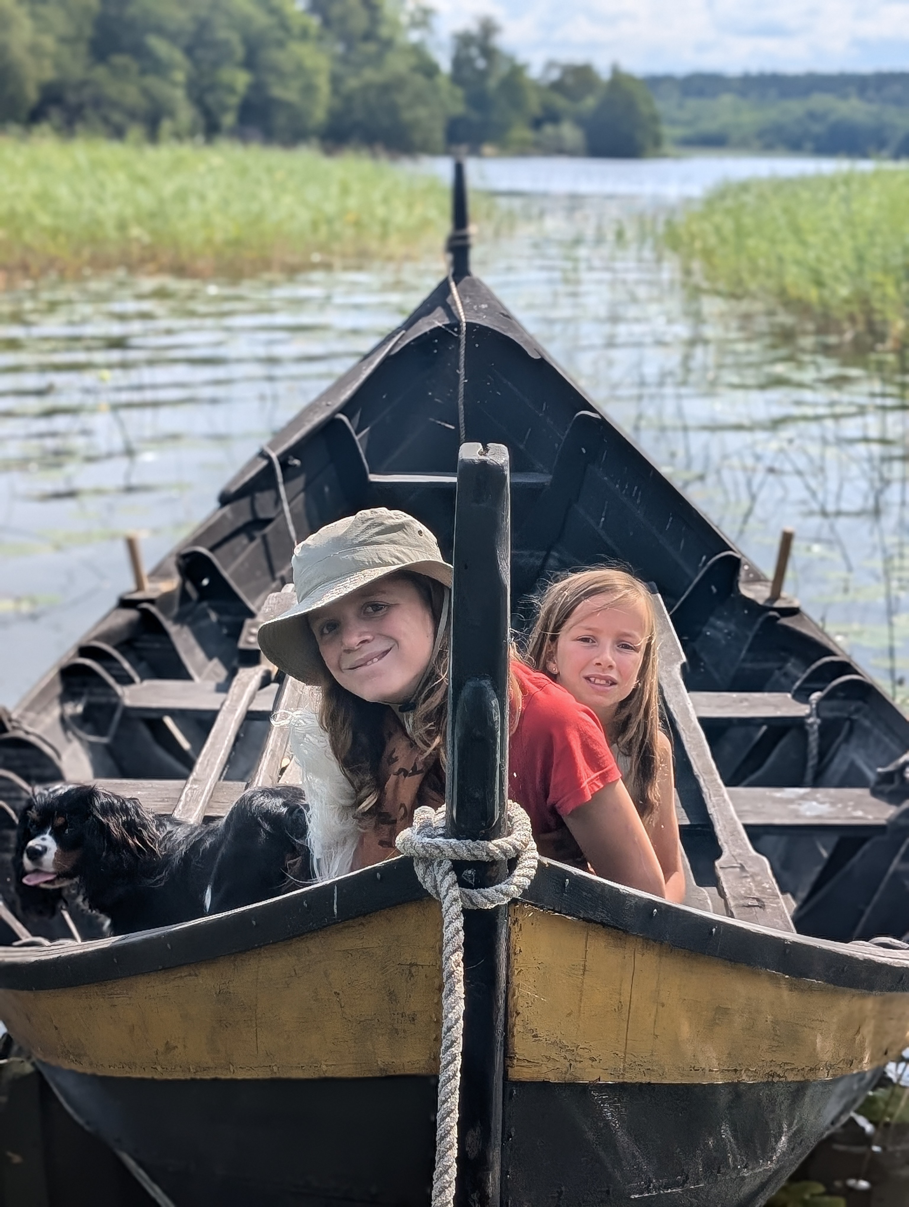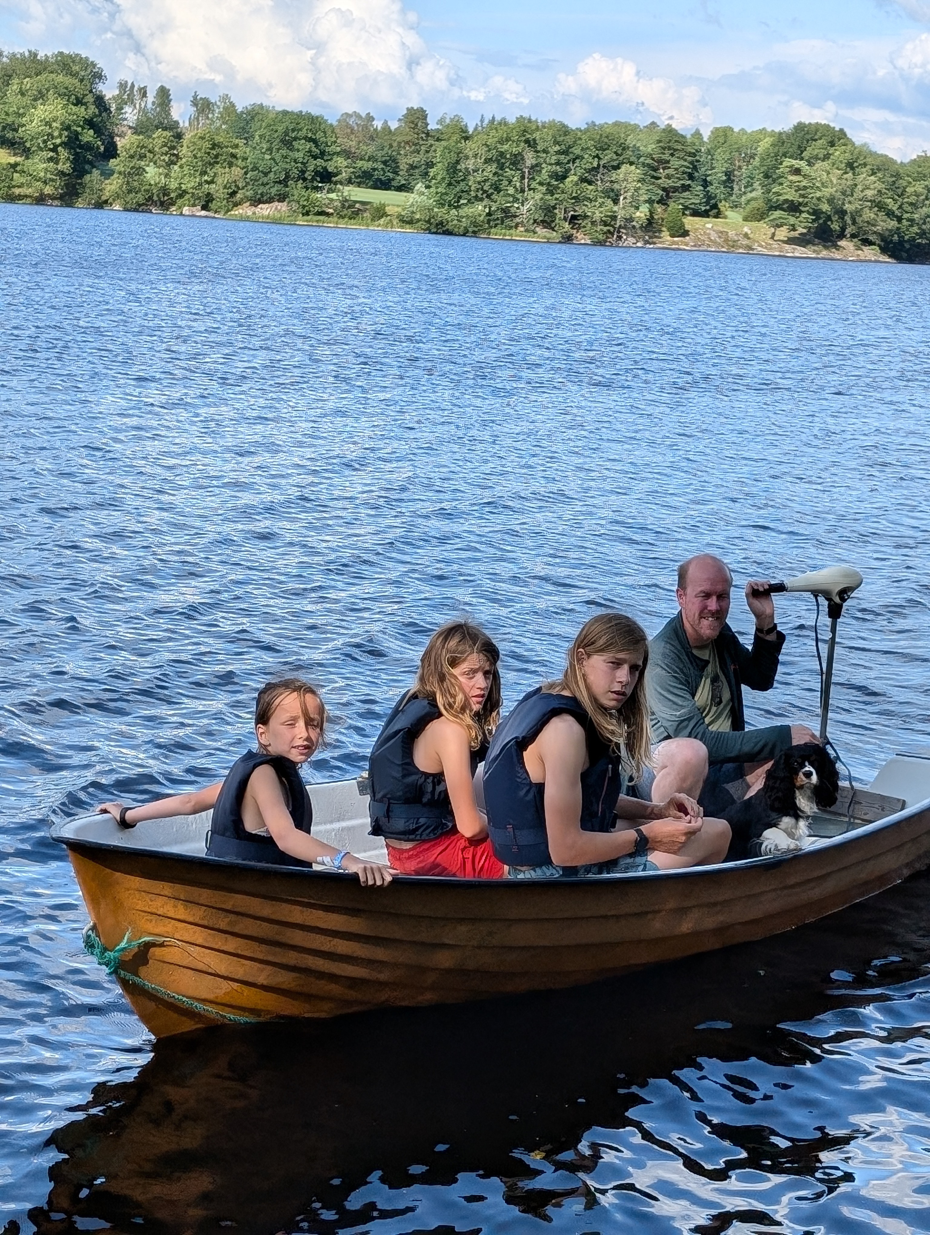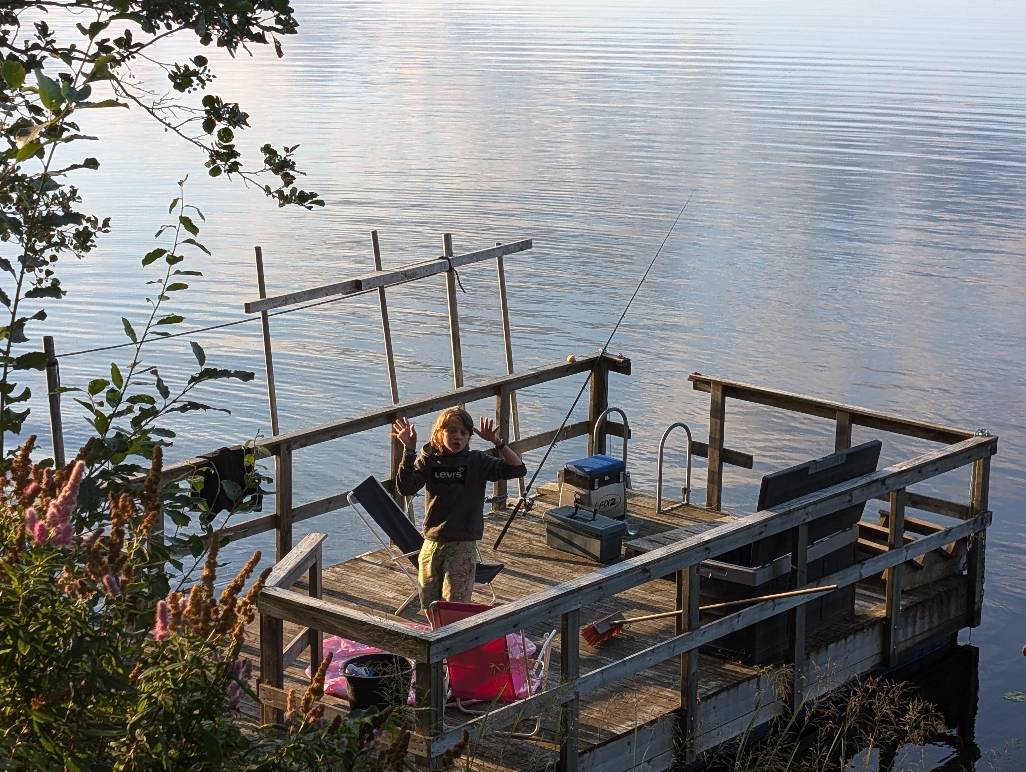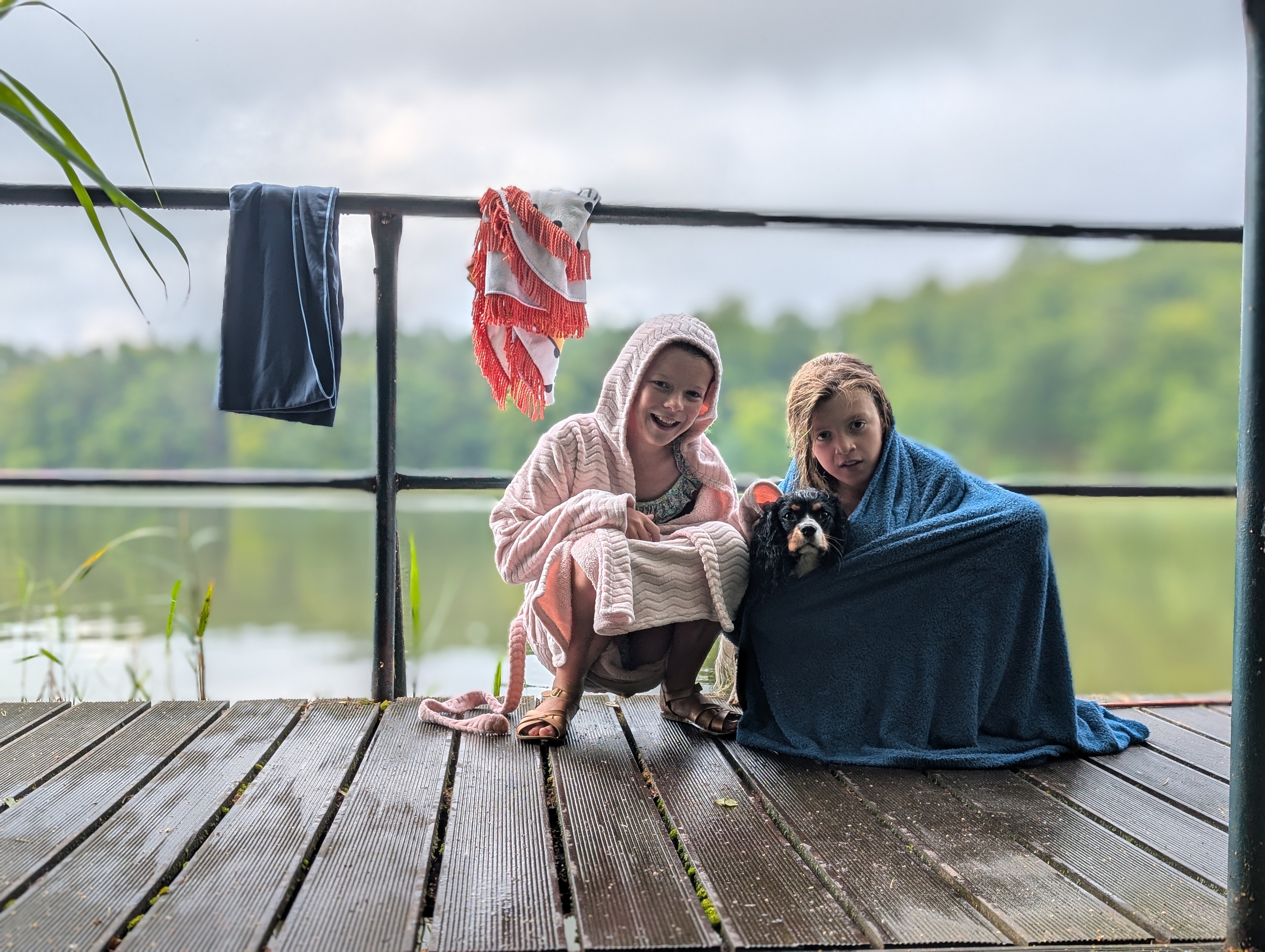 We hebben een prachtig houten terras, een magnifiek zicht op het meer en opnieuw een eigen aanlegsteiger en bootje. Het zwemmen laat ik aan de kinderen over wegens veel te koud zonder wetsuit voor een koukleum als ik.