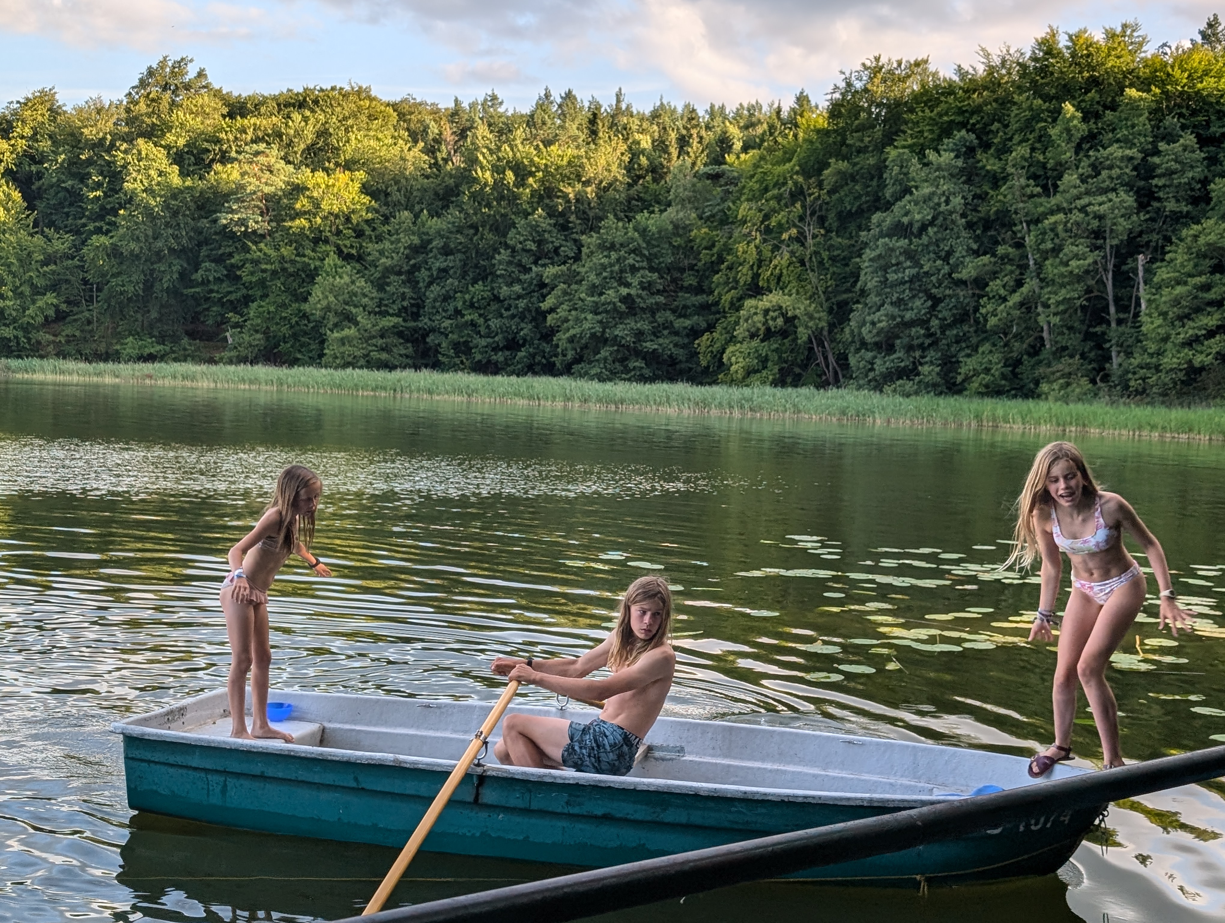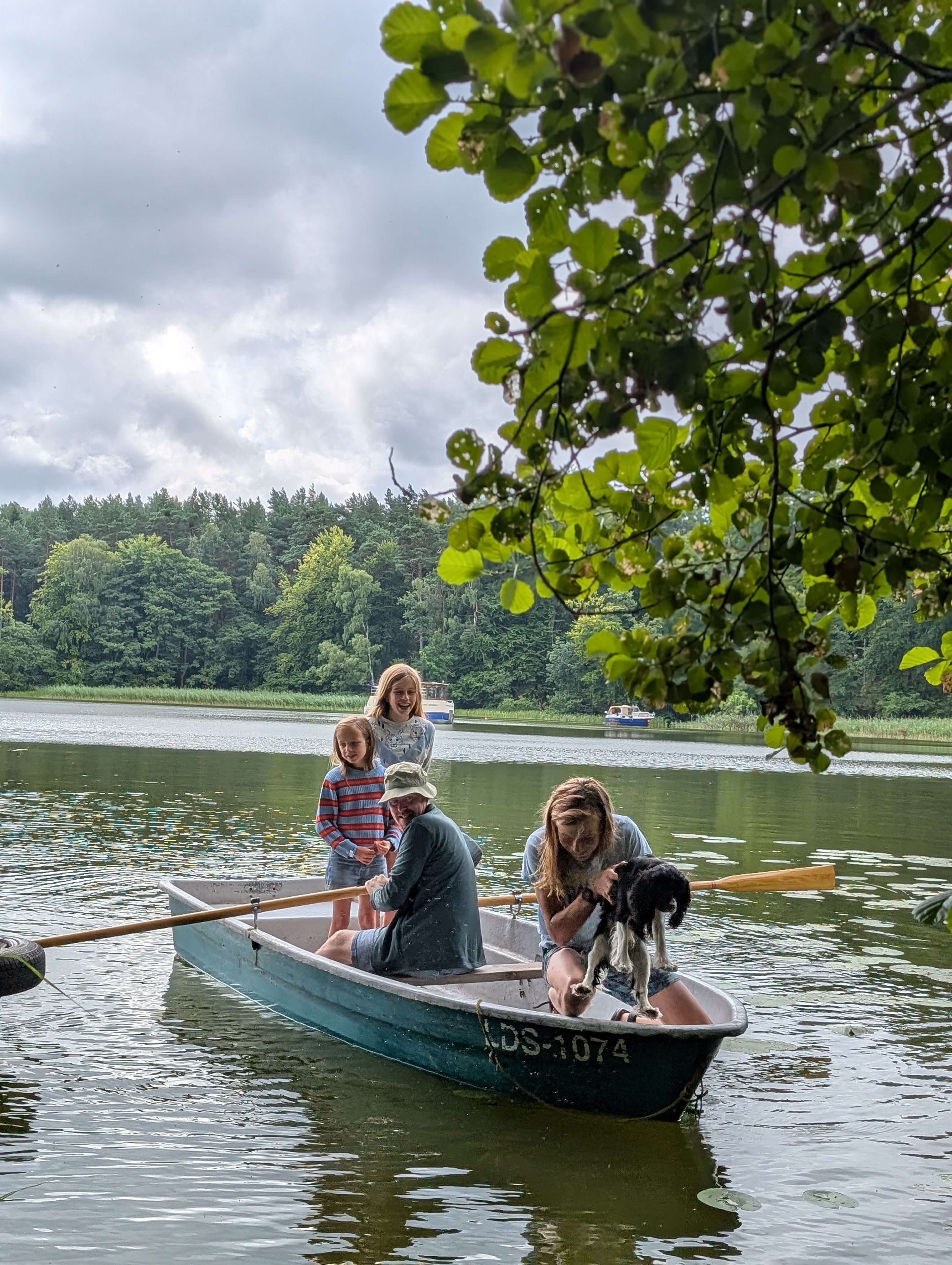 Soit, de regen gaf het op, voorbij de ashoop bleek een alleraardigste aanlegsteiger te liggen en een excellent roeibootje. De kinderen maakten grapjes over dikke muizen in de vallen en stonden in de rij om het bootje uit te testen.