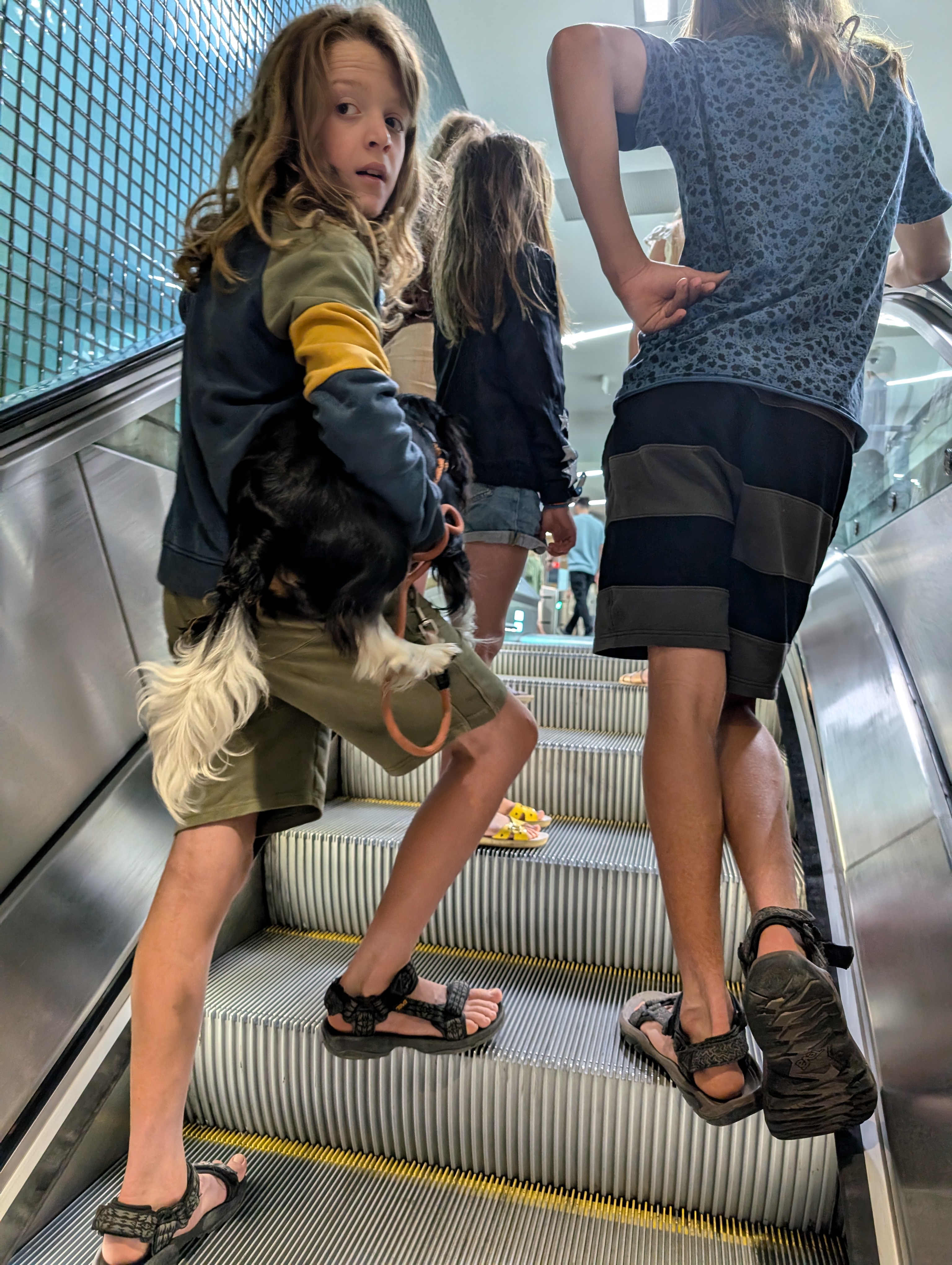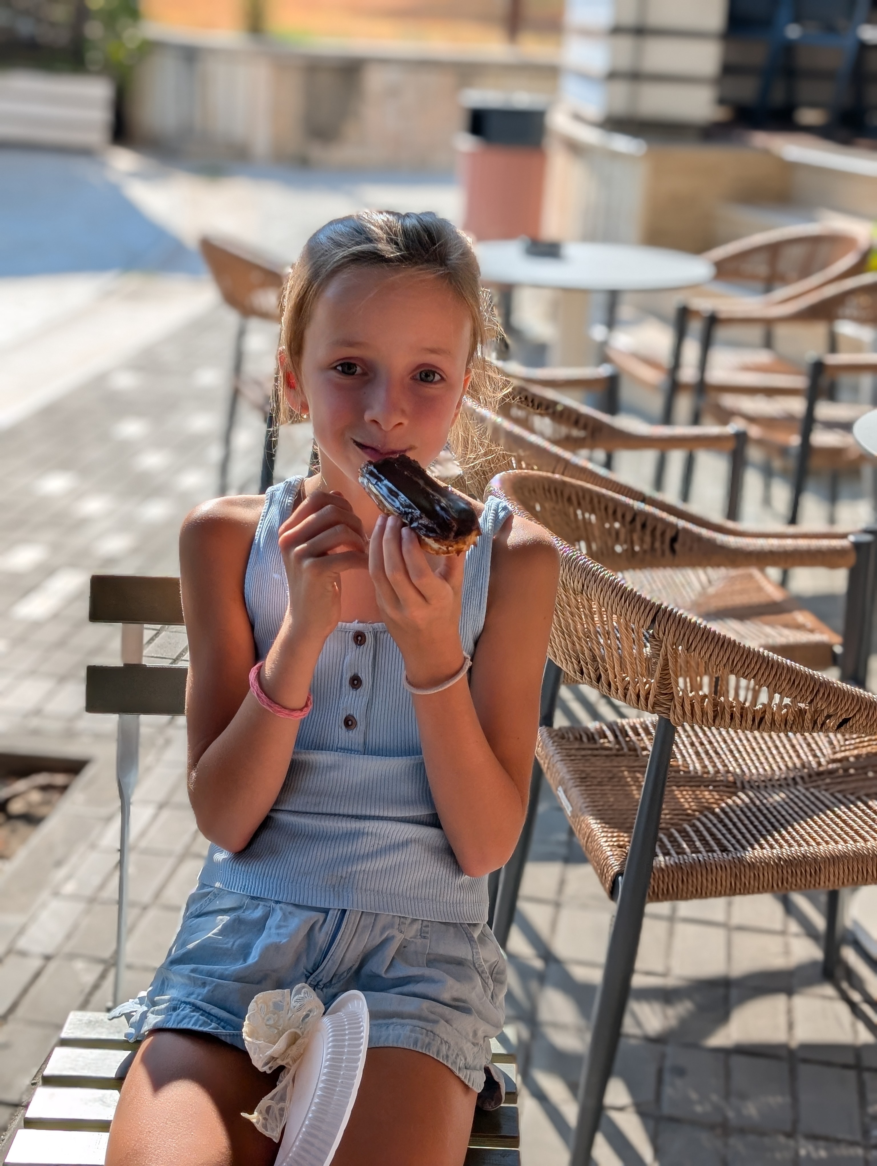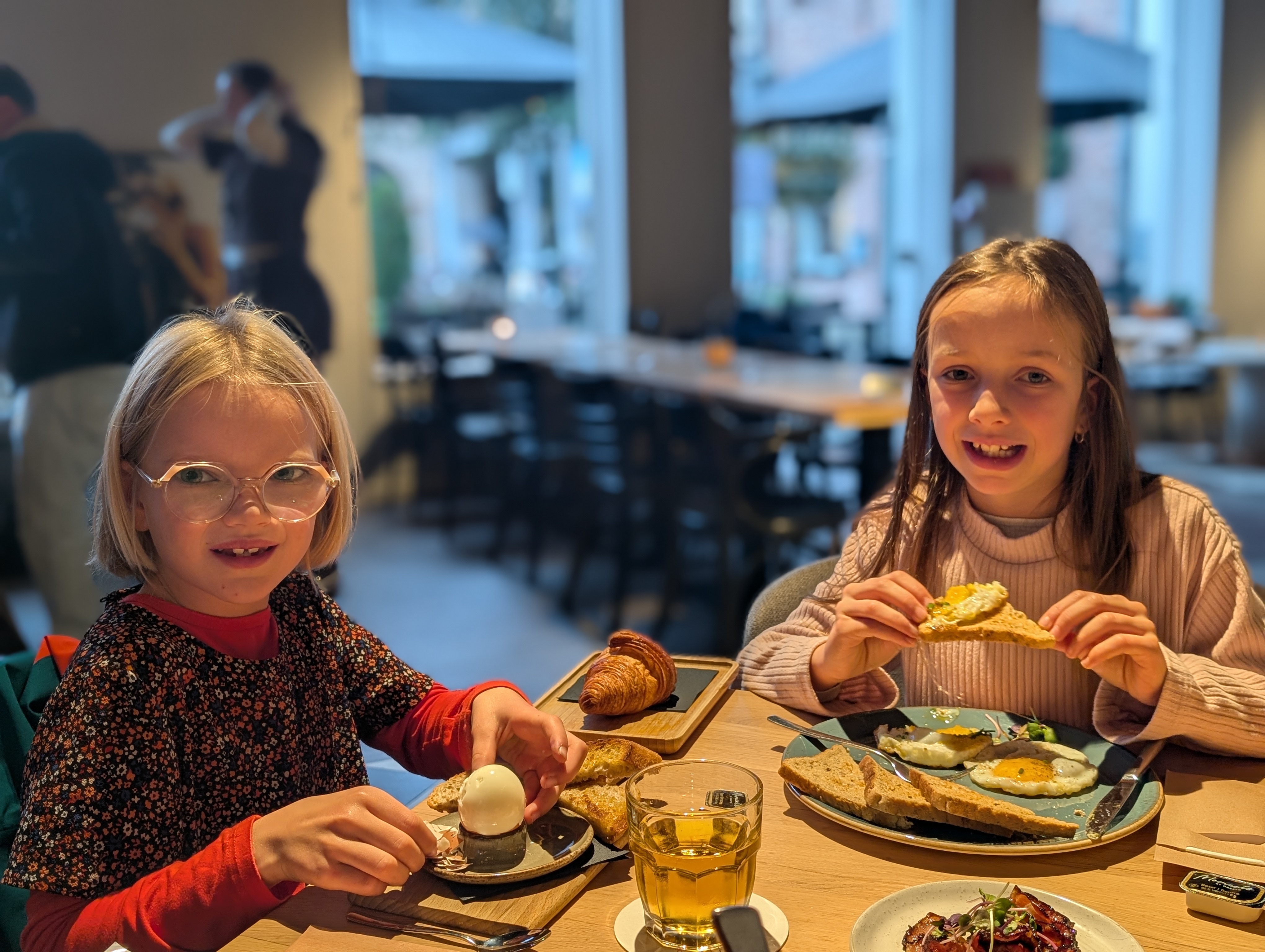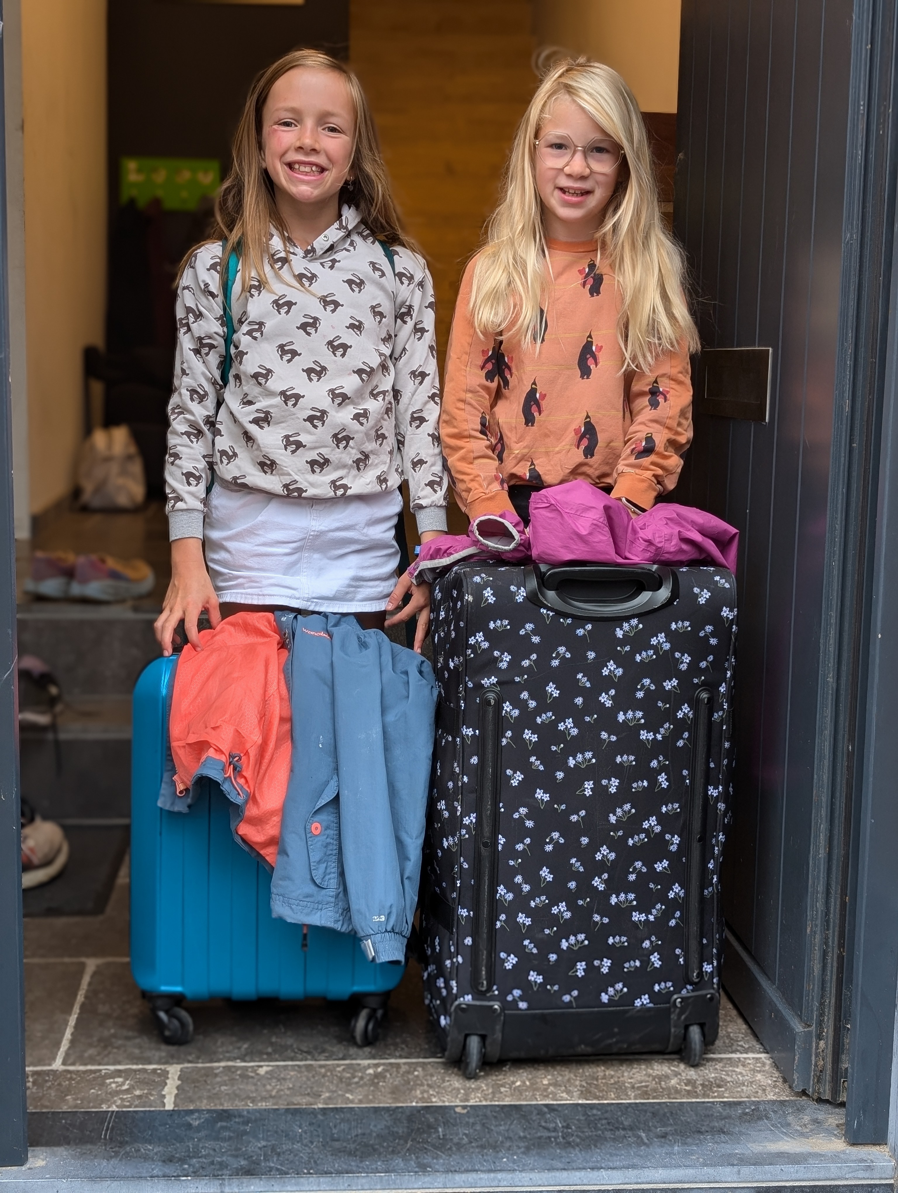 Het all-you-can-eat-buffet bleek best smakelijk en het nachtje in de kajuit verliep vlot. Ollie wilde niet op het hondentoilet , mocht niet in de restaurantsectie op de boot en was daardoor wat de kluts kwijt. De zachtmoedigste dochter vertrouwt me toe dat ze de hele nacht gedacht heeft dat de boot zou zinken. Het deel van onze kinderschare dat altijd extra aanmoediging nodig heeft voor tanden poetsen en verse kleren aantrekken, maakt schaamteloos misbruik van die ene reistas die we tussen de 2 kajuiten heen en weer dragen en verschijnt aan het ontbijt in een multifunctionele slaap-, eet- en leefoutfit. Maar voor de rest is deze manier van reizen meer dan ok.