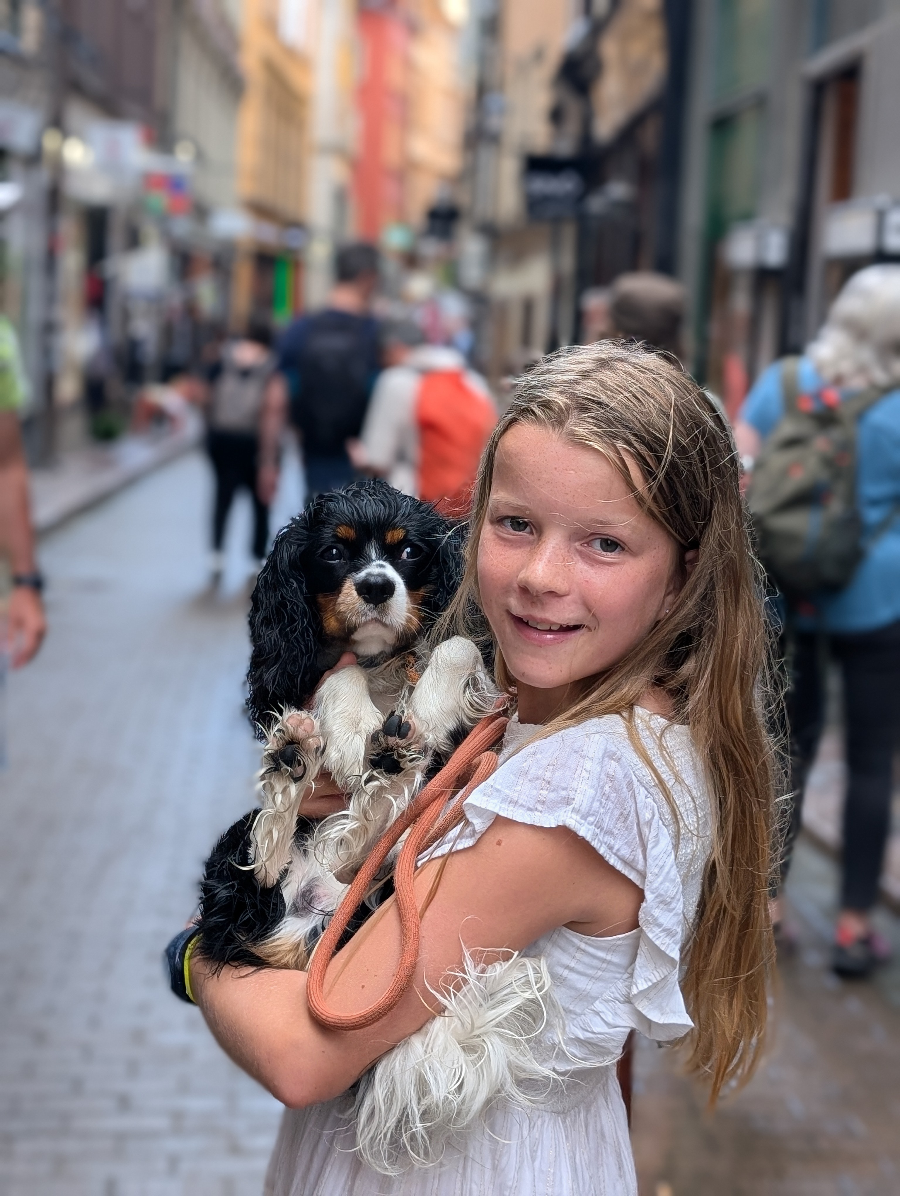 Soit, voor ons werkt het prima en het brengt me vaak veel onverwacht schoons. Tijdens ons dagje Stockhom waar we met de trein heengingen bleek Ollie bijvoorbeeld niet welkom in het openluchtmuseum Skansen. Geen nood, kleine zus zag een middag met moeder en hond alleen wel zitten, en zo ontdekten wij met z’n drietjes de prachtige historische binnenstad en schuilden we in een heel fijn koffiehuisje voor een plotse plensbui.