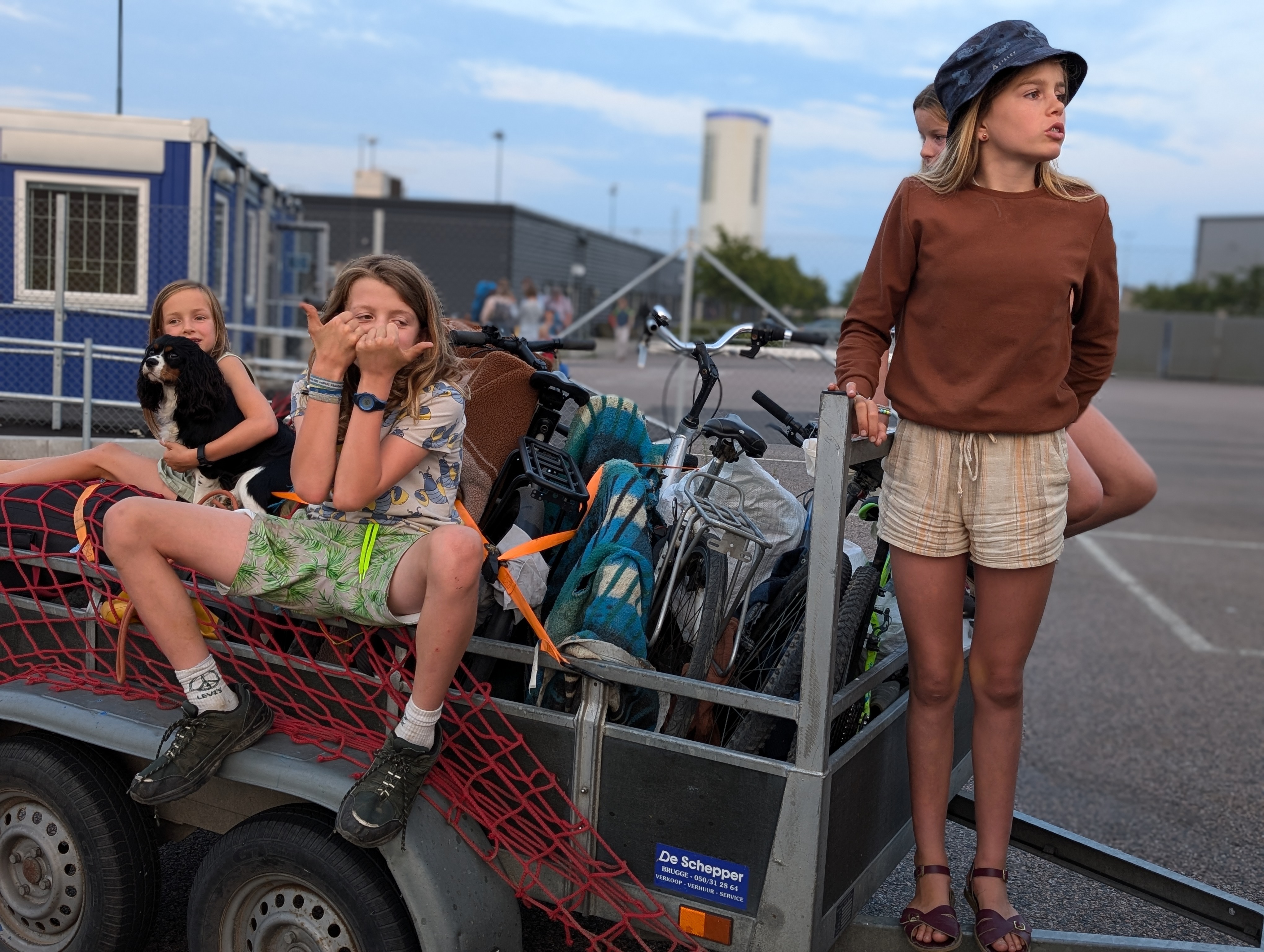 Manlief zorgt ervoor dat dit uiteindelijk gefixt raakt en laadt met militaire precisie de fietsen op de aanhangwagen. Oude dekens en sporttassen in plastic zakken zorgen dat de lading netjes op zijn plaats blijft. (Ik heb me er al over gezet dat dit niet netjes onder een waterdicht zeiltje kan.)