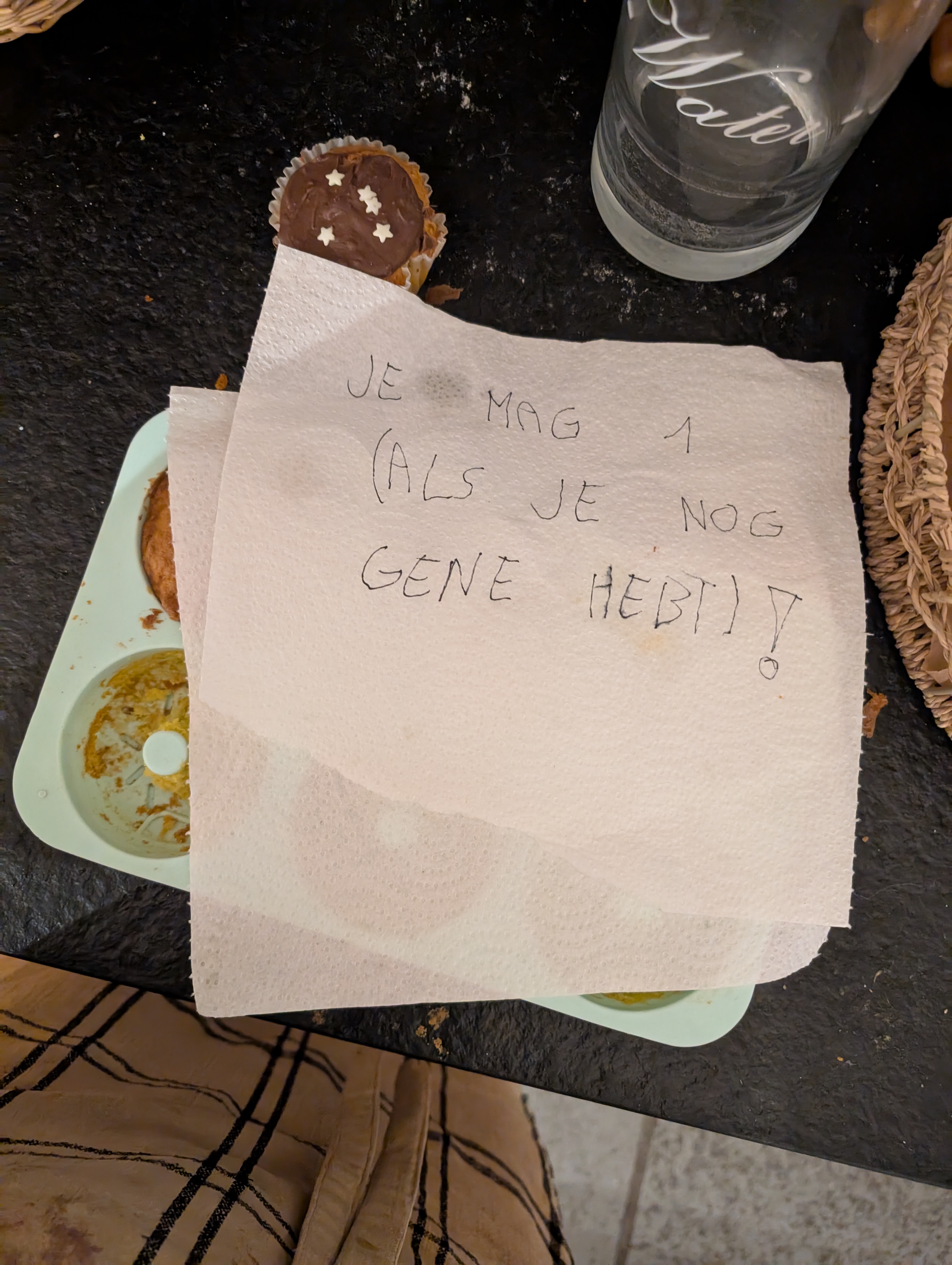 De sint kwam langs en bracht chocolade en knutsel- en bulletgerief voor de meisjes. Voor de jongens komt er voor grote broer nog een ‘loopstoel’ om de wachttijd voor de start van de veldlopen op af te wachten en werkgerief of iets voor zijn dieren voor kleine broer. (Maar daarvoor gaan ze na de examens zelf naar de winkel.)