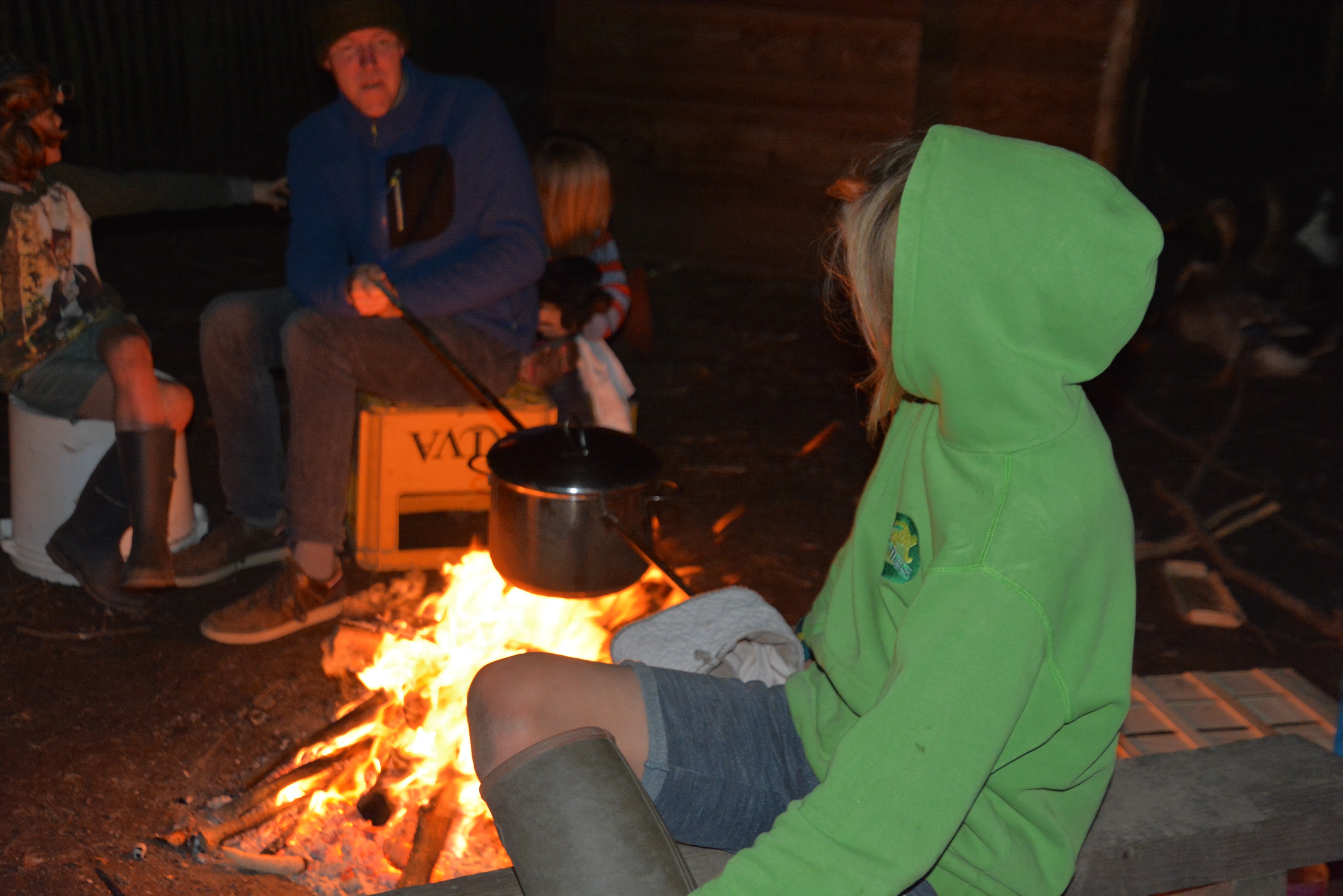 ’s Avonds als het donker is. Bij een vuurtje. In de kippenren.
