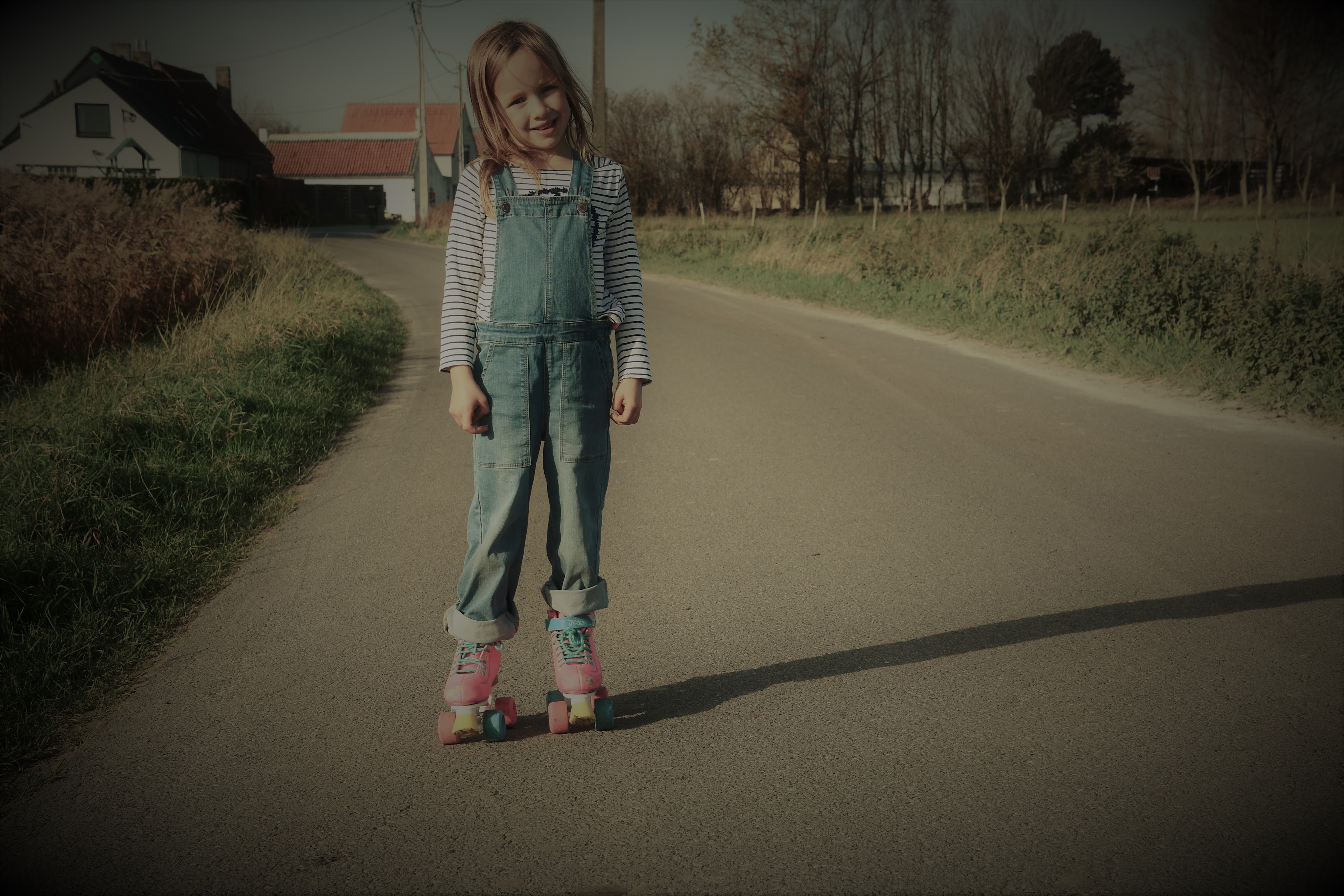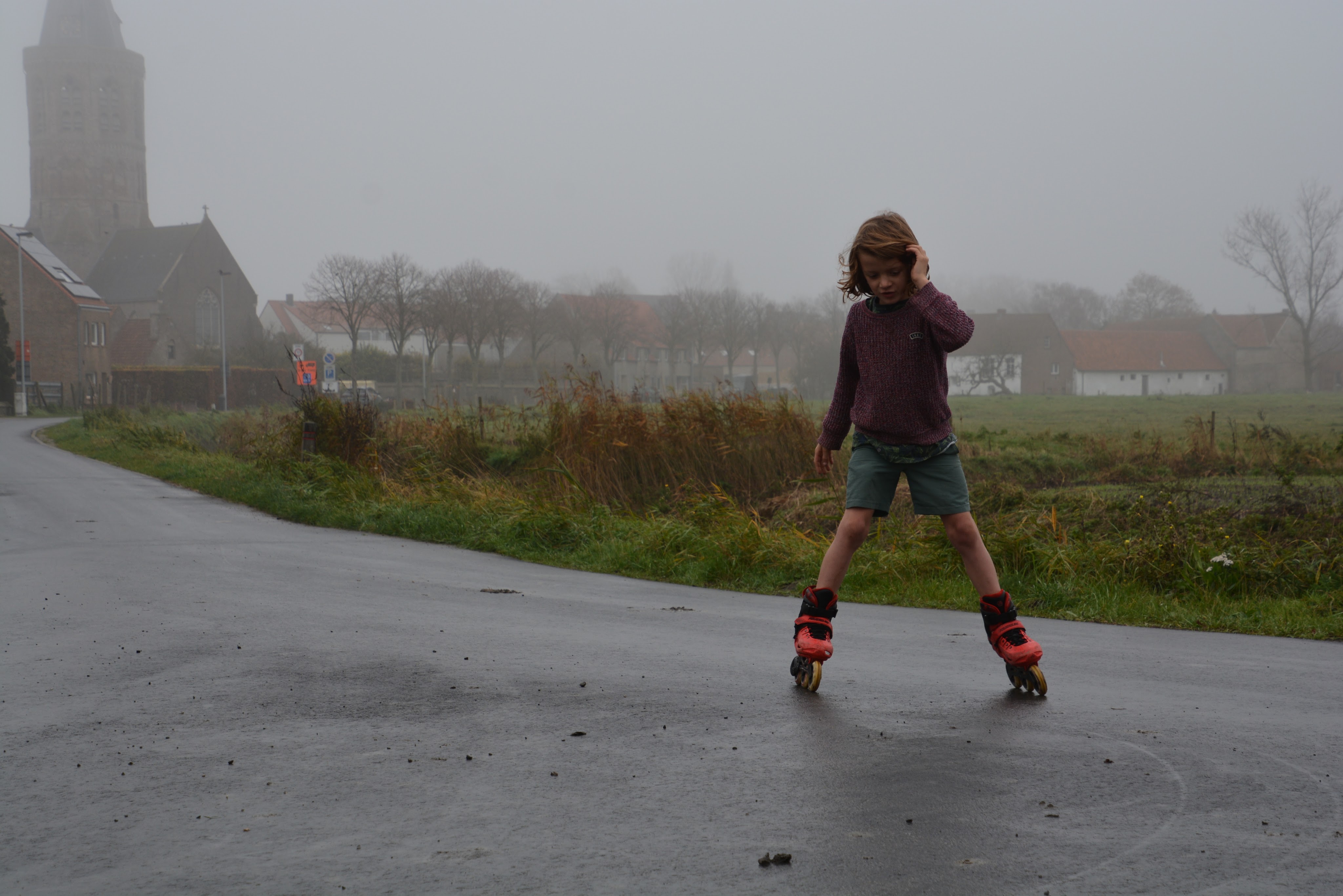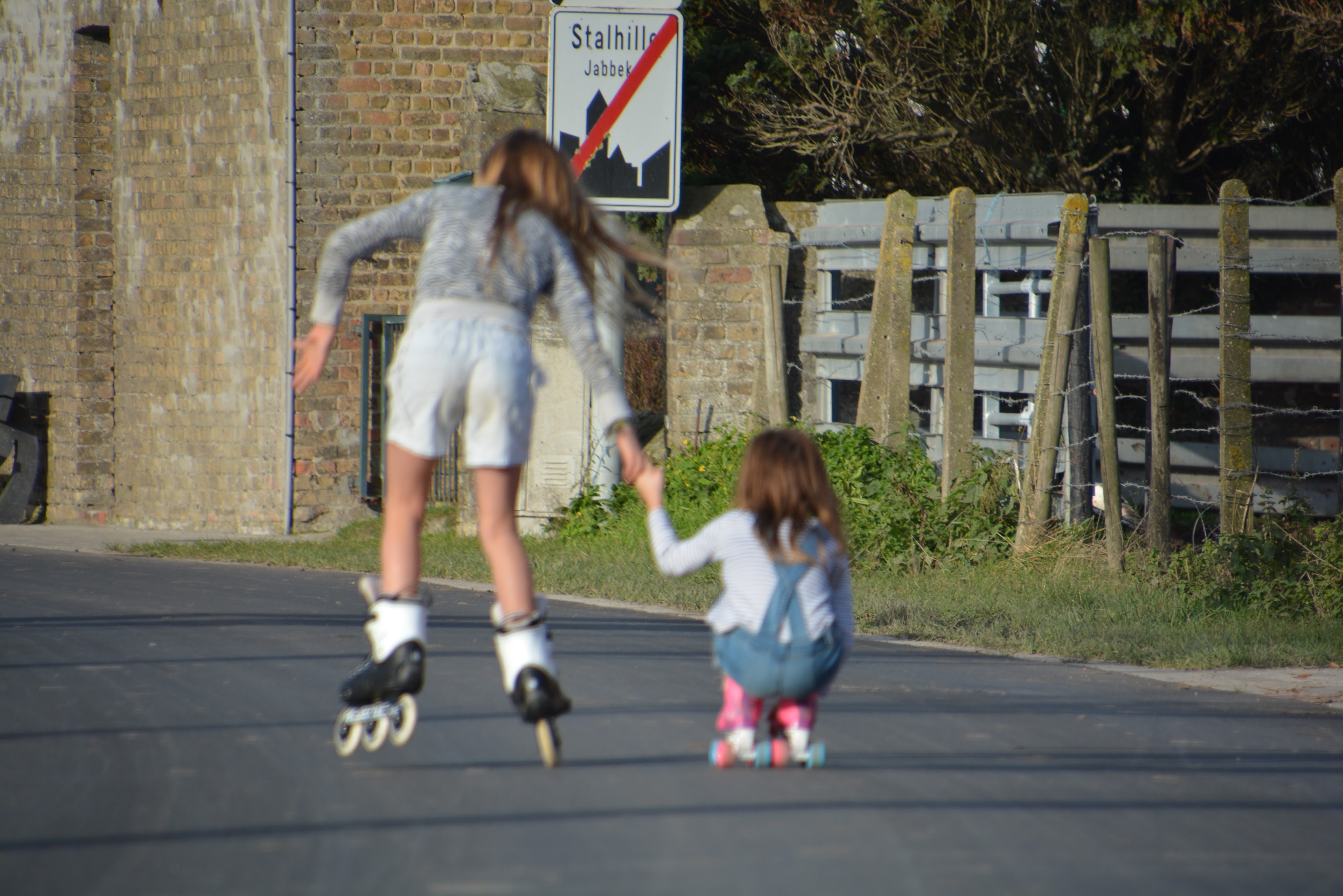 Zo is het nieuwe stukje asfalt op een van de drie straten die ons dorp rijk is, een excellente ondergrond om pirouettes te draaien op je skeelers. Een wandelingetje die kant uit geldt hier als een uitstapje. (Great kids, I know)