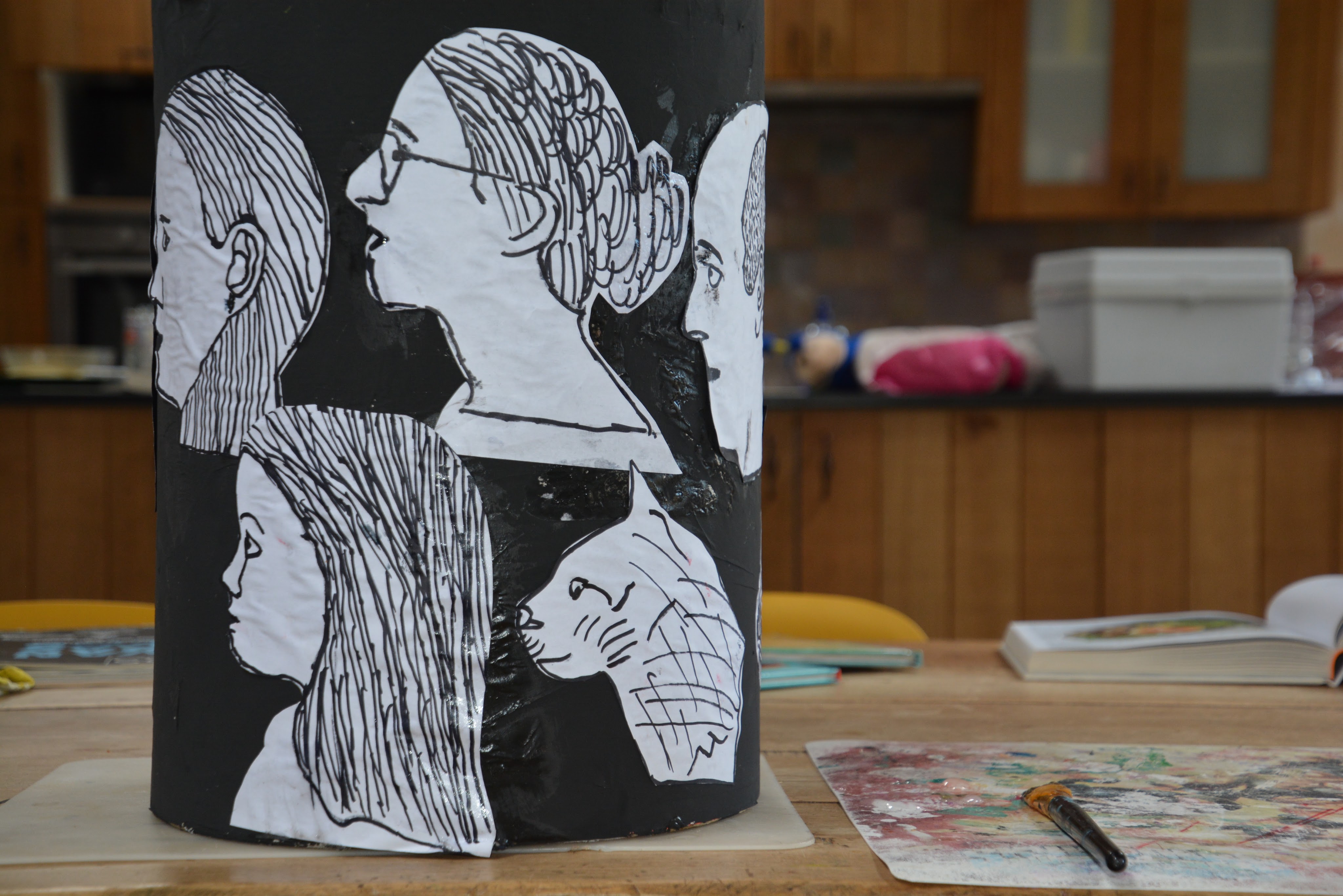 - benodigdheden: (retro) wasmiddeltonnnetje – oude kranten – knutsellijn – geprinte foto’s – zwarte alcoholstift – zwarte verf